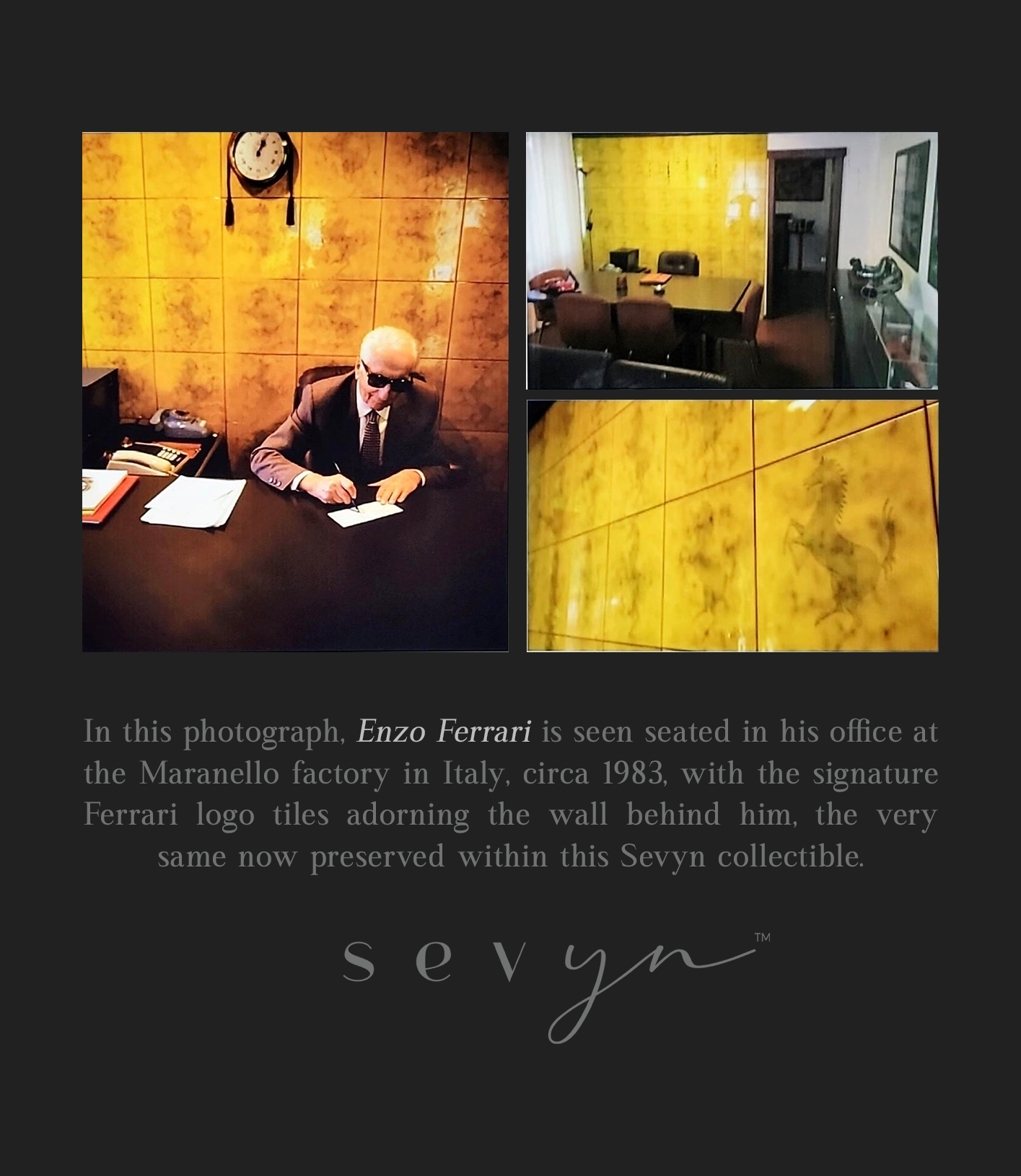 A collector’s dream — an original Enzo Ferrari–signed book cover paired with an authentic tile from his personal office wall in Maranello, Italy. These fragments of history, once part of the space where Ferrari’s legacy was born, have been masterfully preserved in a handcrafted wood shadowbox, accompanied by archival black-and-white photographs and full JSA authentication. Exceptionally rare and nearly impossible to source,For the true Ferrari connoisseur, it is more than a collectible — it is a tangible piece of Italian automotive history, destined for those who understand rarity, provenance, and the art of ownership. Anyone can purchase a Ferrari car from a showroom, but this being a relic of Enzo’s own world, cannot be bought again.