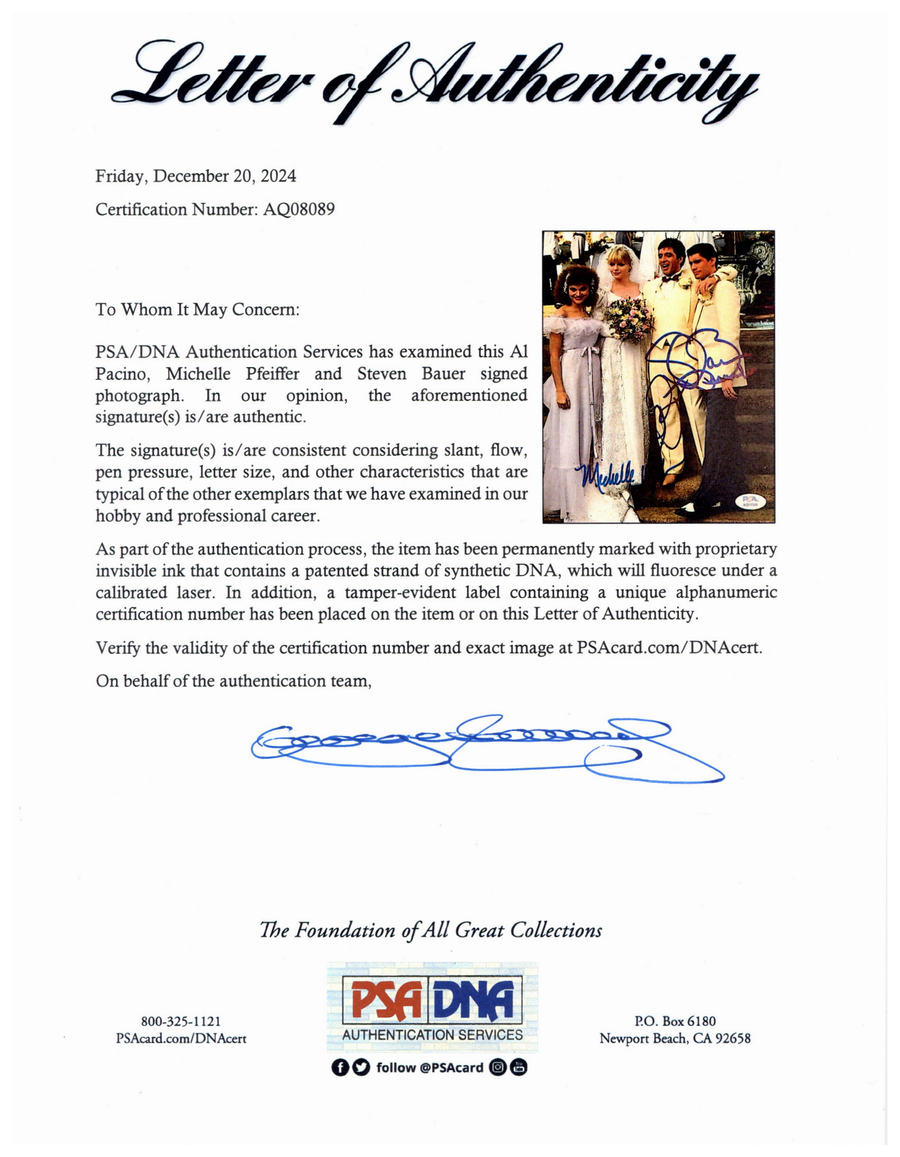This exquisite wood shadowbox showcases an iconic Scarface movie poster accompanied by a PSA authenticated color photo signed by Al Pacino, Michelle Pfeiffer, and Steven Bauer. Featuring a movie prop and two elegantly engraved plaques, display is a distinguished collector's piece that captures the essence of cinematic history with refined craftsmanship.