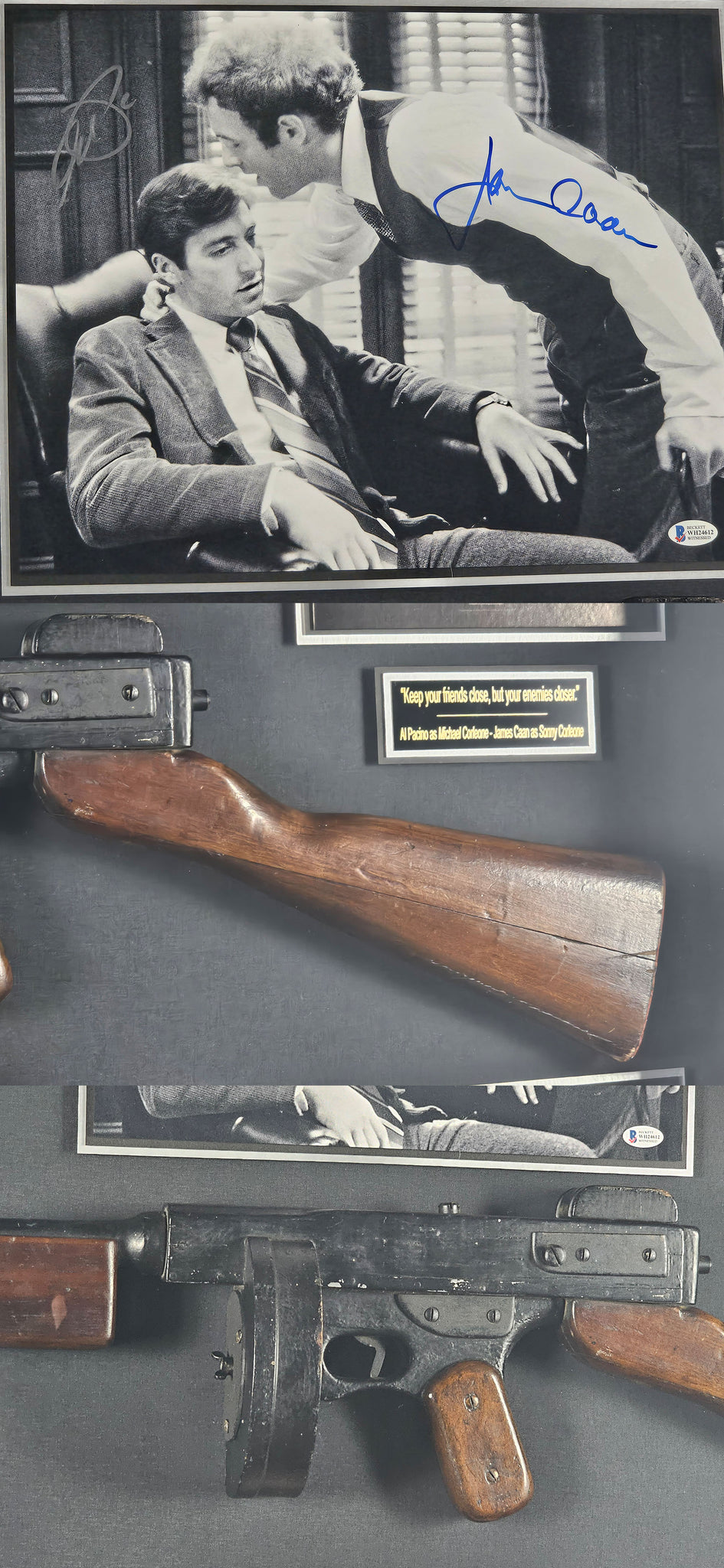 A bespoke Sevyn Collectibles archival display featuring a satin-finish movie still photograph by famed still photographer Steve Schapiro, hand signed in fibre-tip markers by Al Pacino and James Caan.