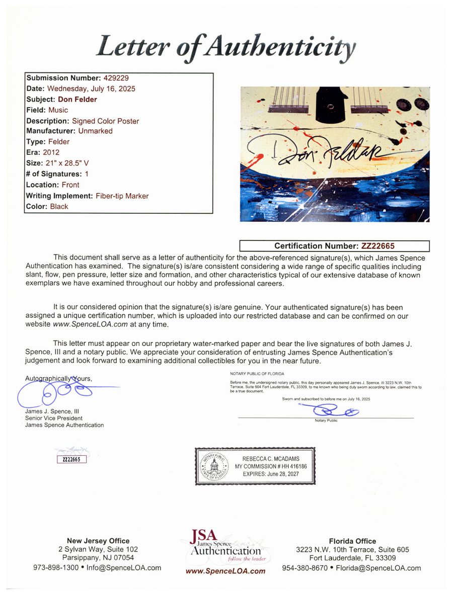 This elegant wood shadowbox showcases an Eagles SA Authenticated Signed Guitar Poster by Don Felder, measuring . It features two color photographs, a CD cover, and two finely engraved plaques, creating a distinguished display piece that honors the legacy of this iconic musician. Perfect for collectors and fans seeking a refined tribute to Don Felders artistry.